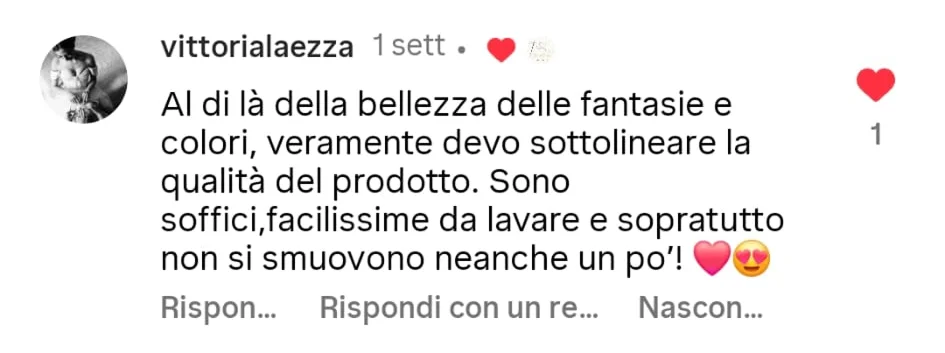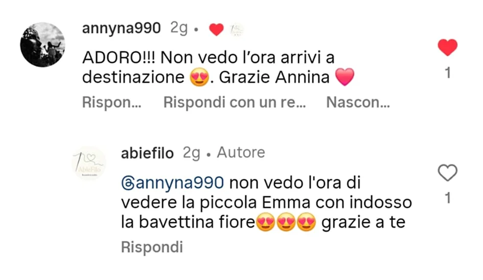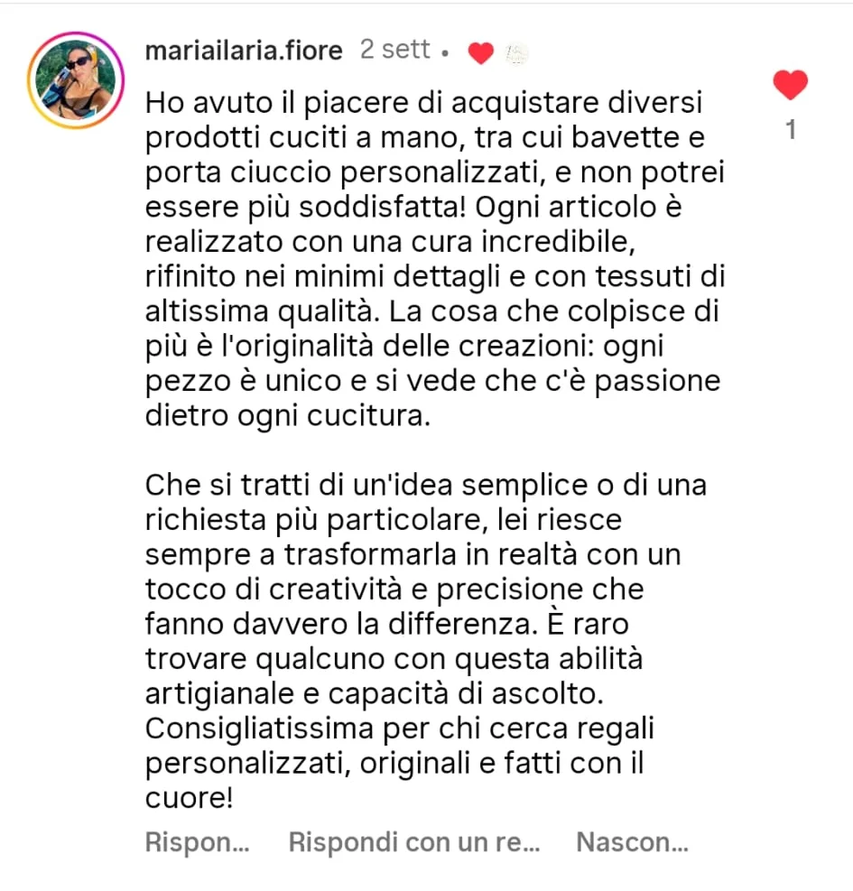 Ho avuto il piacere di acquistare diversi prodotti cuciti a mano, tra cui bavette e porta ciuccio personalizzati, e non potrei essere più soddisfatta! Ogni articolo è realizzato con una cura incredibile, rifinito nei minimi…