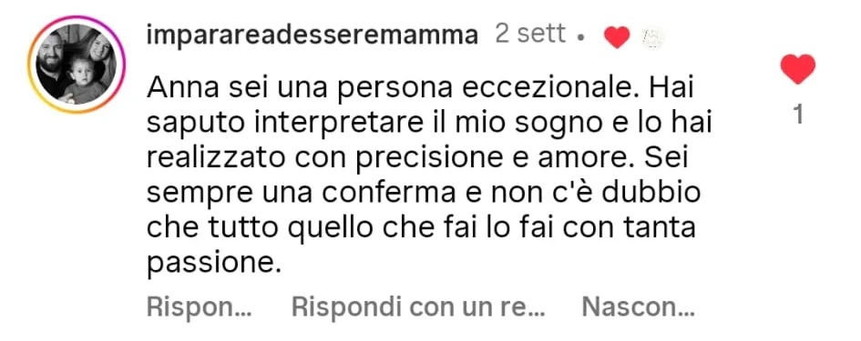 Anna sei una persona eccezionale. Hai saputo interpretare il mio sogno e lo hai realizzato con precisione e amore. Sei sempre una conferma e non c’è dubbio che tutto quello che fai lo fai con tanta passione.