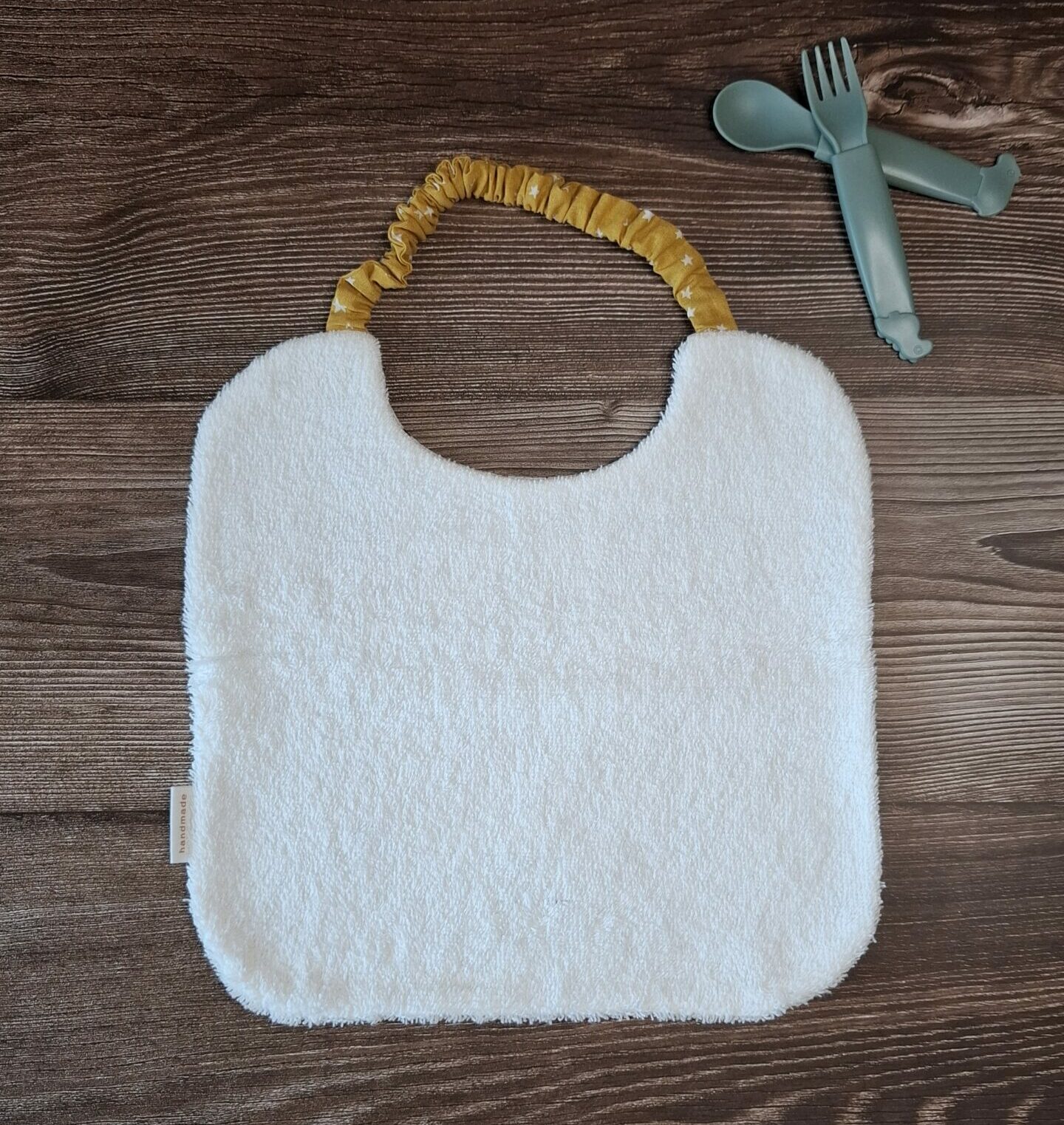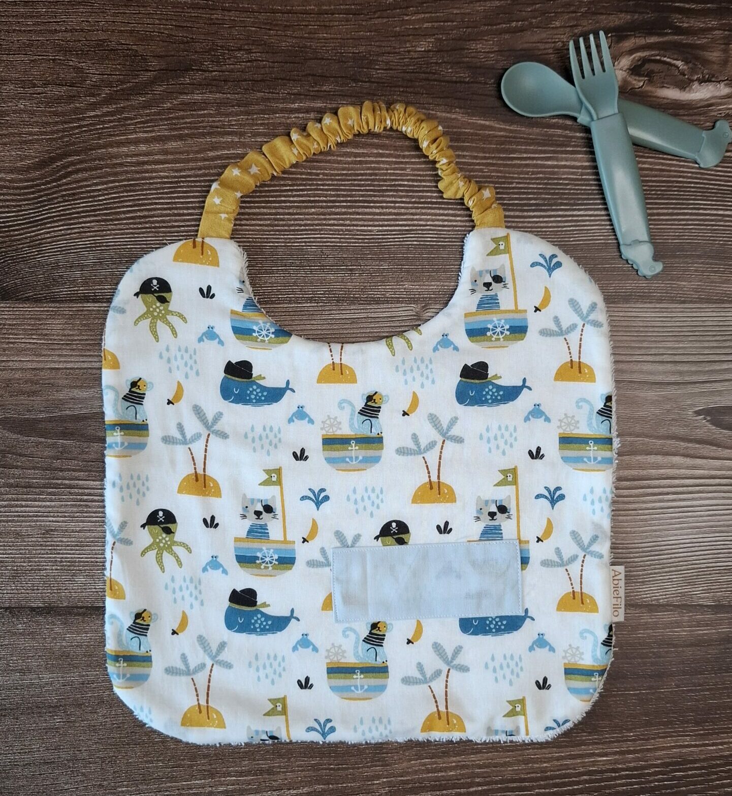 Bavetta realizzata a mano con tessuti morbidi, resistenti e super assorbenti. Accompagna i pasti dei più piccoli, proteggendo i vestitini con praticità e stile.