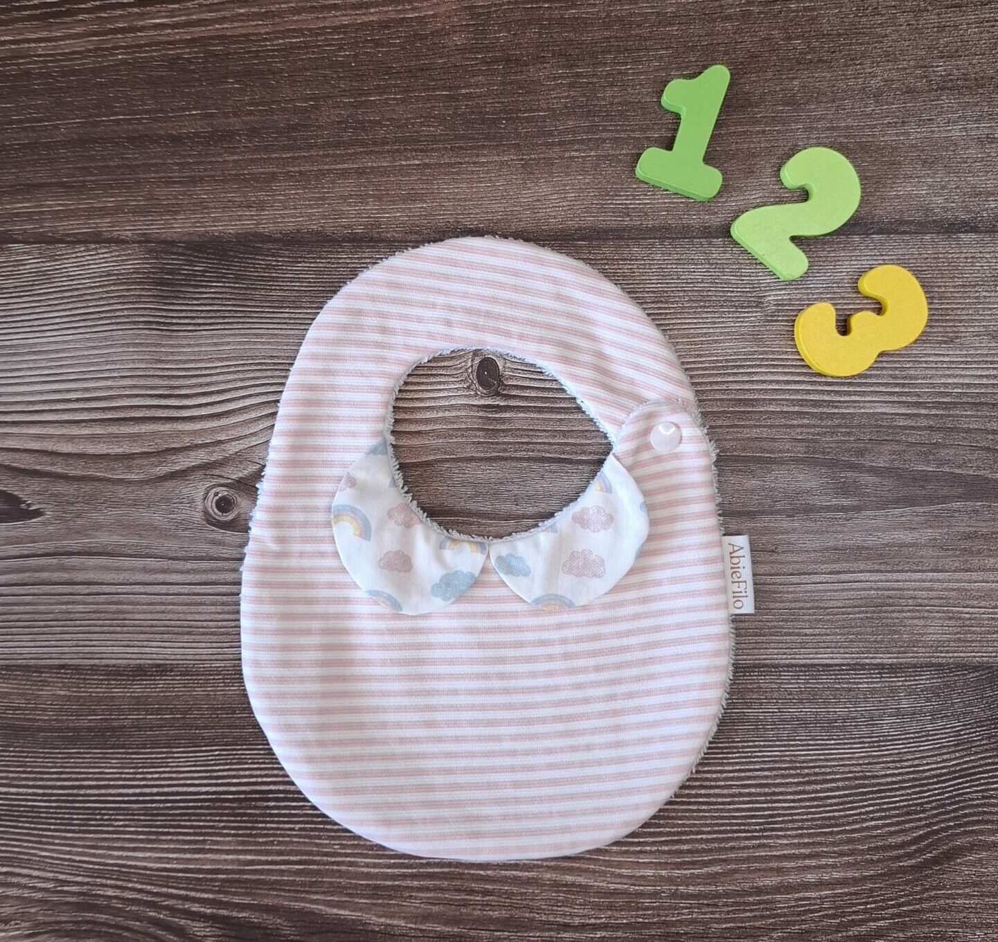 Questa bavetta, realizzata a mano, conquista con il suo delizioso colletto. Accompagna le poppate della tua bambina aggiungendo un tocco di stile.