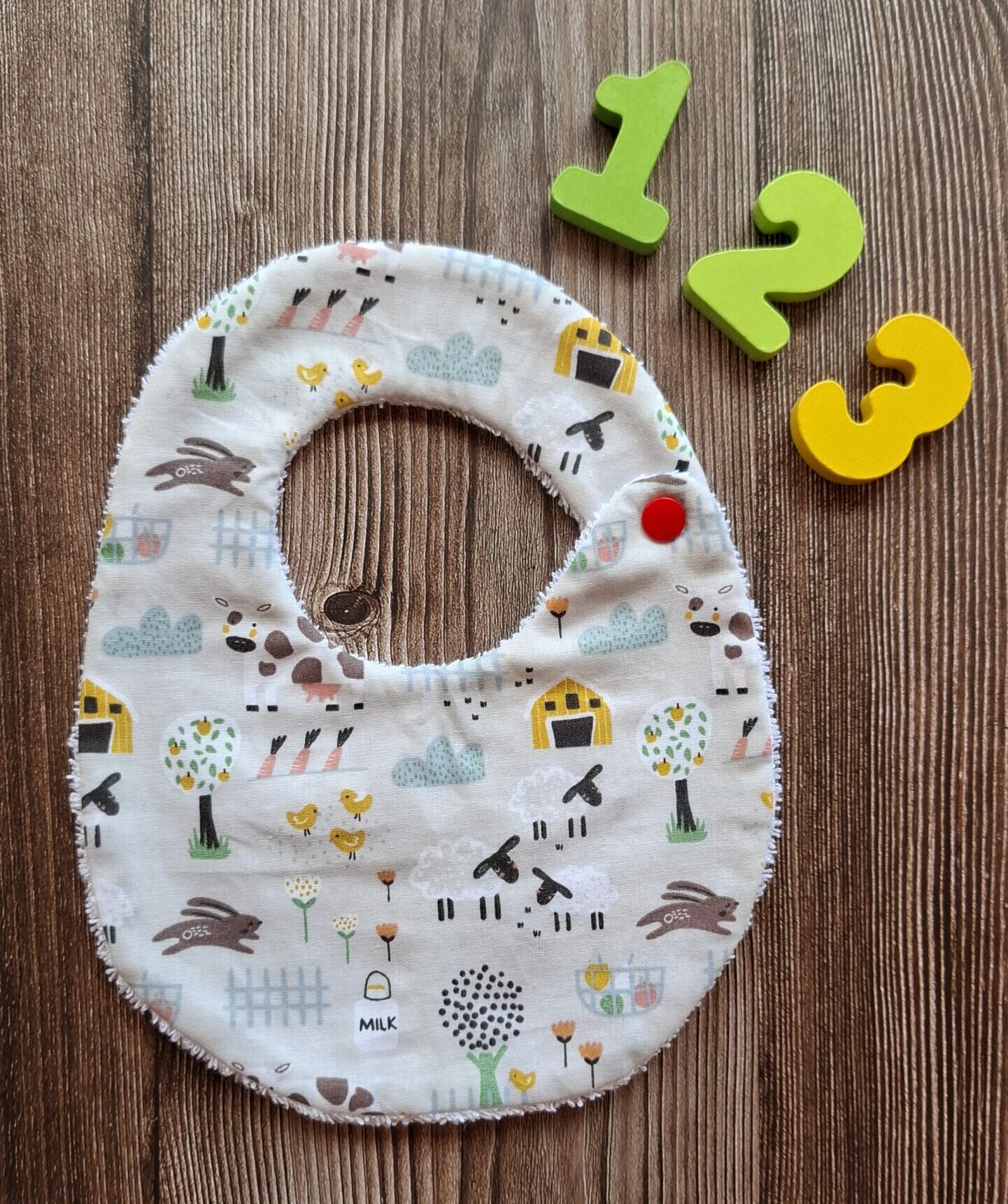 Bavetta realizzata a mano con tessuti morbidi e resistenti. Unisce praticità e stile ad ogni poppata.