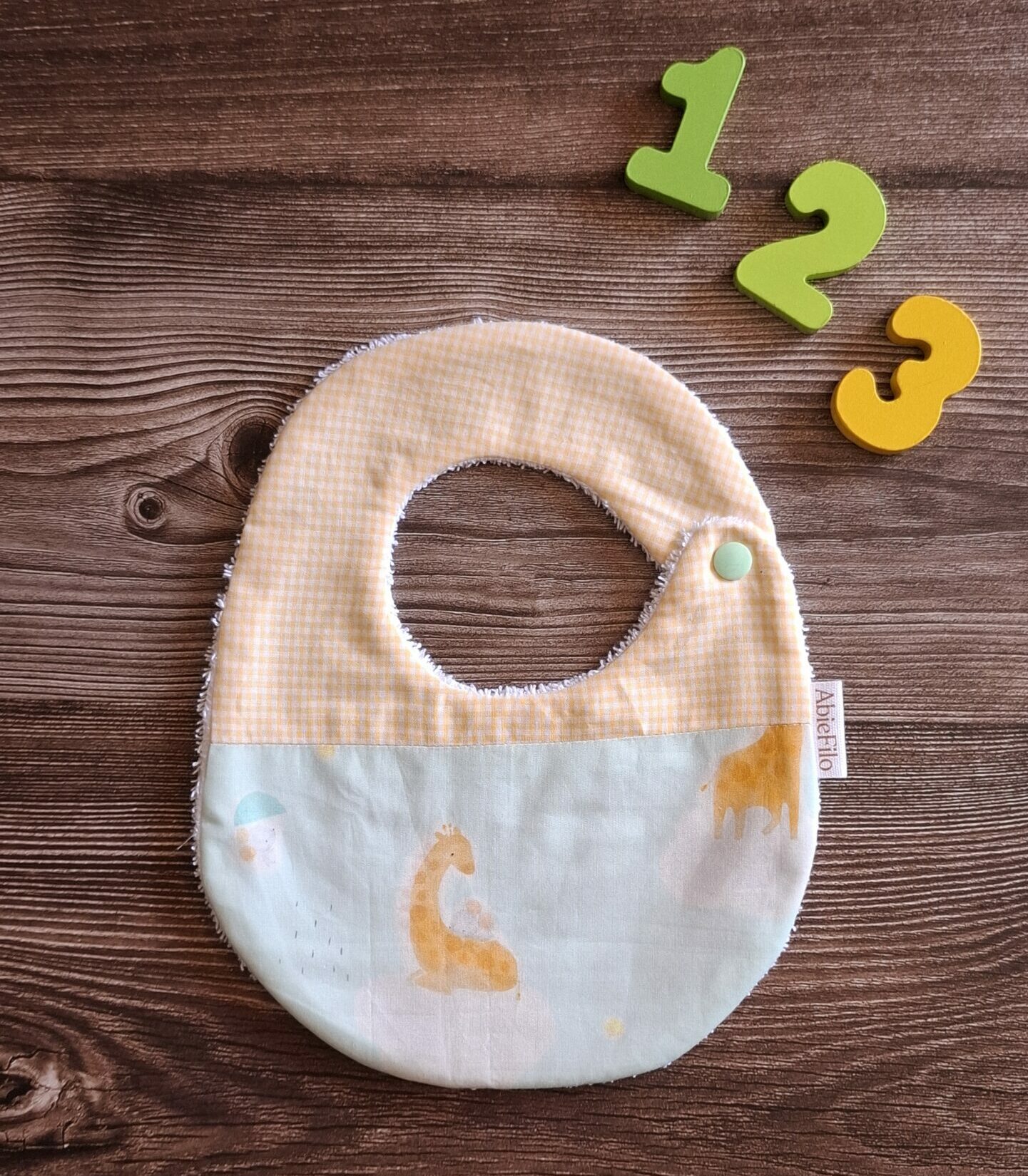 Bavetta realizzata a mano con tessuti morbidi e resistenti. Unisce praticità e stile ad ogni poppata.