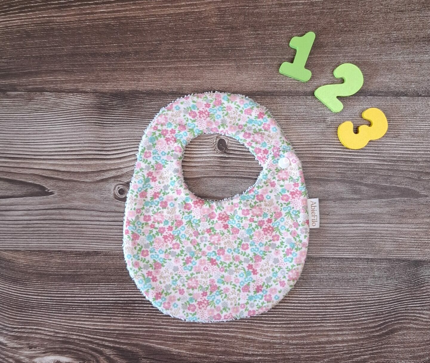 Bavetta realizzata a mano con tessuti morbidi e resistenti. Unisce praticità e stile ad ogni poppata.