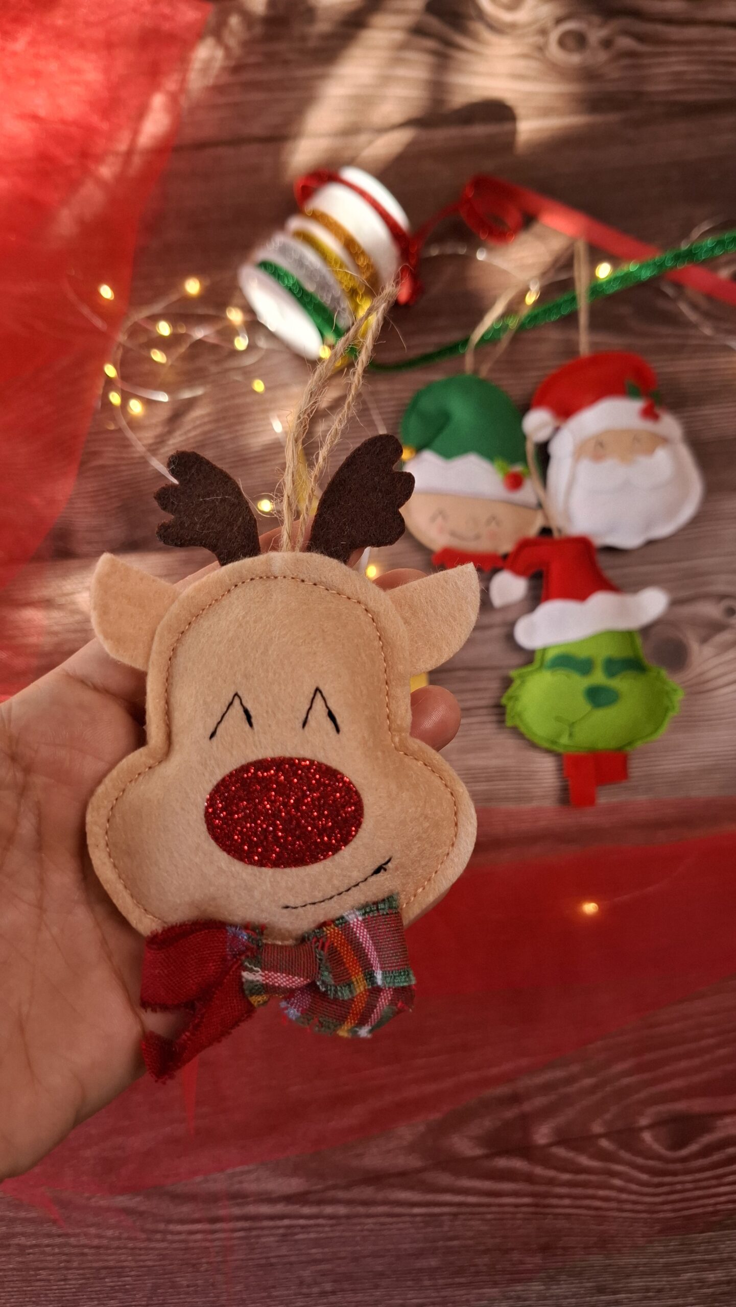 Con il suo dolcissimo naso rosso, Rudolph la renna proprio non poteva mancare tra le mie decorazioni di Natale artigianali! Realizzato a mano in morbido pannolenci con un elegante fiocco tartan, porterà tanta allegria sul tuo albero di Natale.