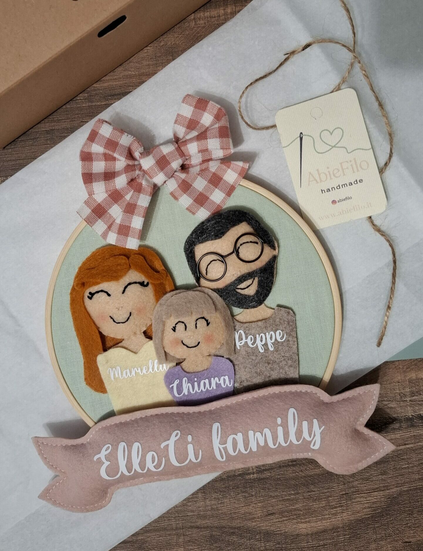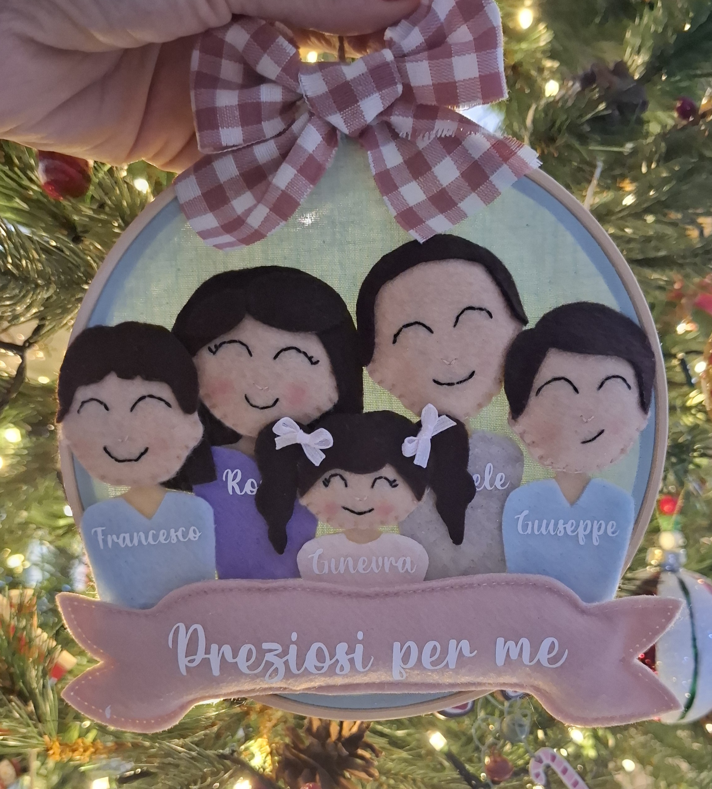 Il Family Circle AbieFilo handmade è un dolcissimo cerchio di famiglia in pannolenci, interamente cucito a mano, che ritrae la tua famiglia con volti stilizzati e sorridenti.