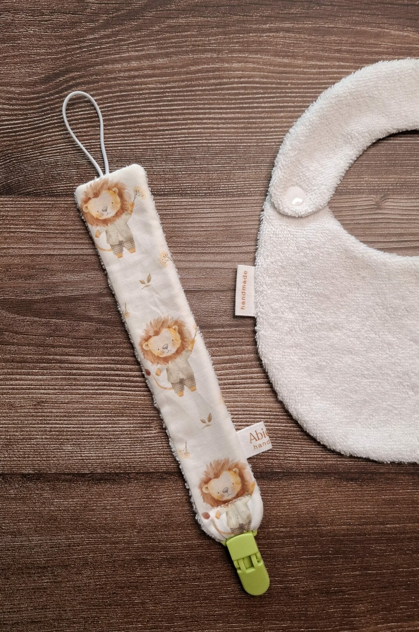 Elegante e sicuro, questo portaciuccio artigianale è un accessorio indispensabile per i primi mesi. Morbido e resistente, mantiene il ciuccio a portata di mano evitando la caduta o lo smarrimento.