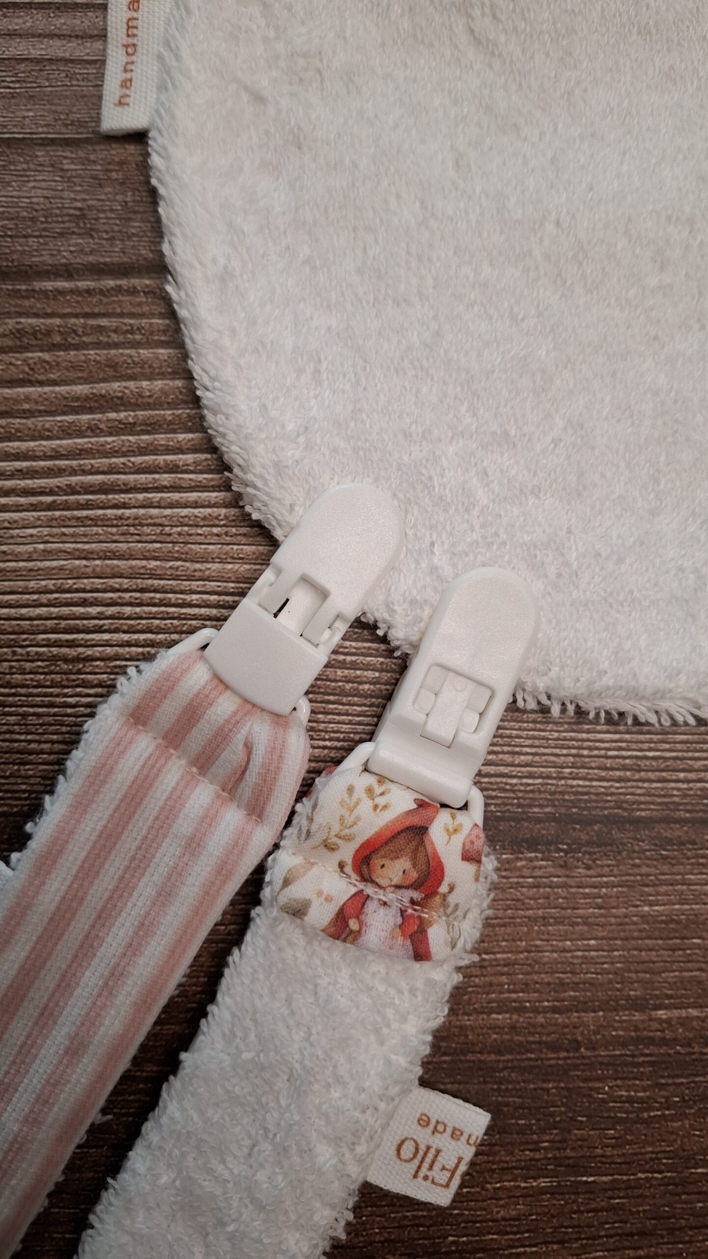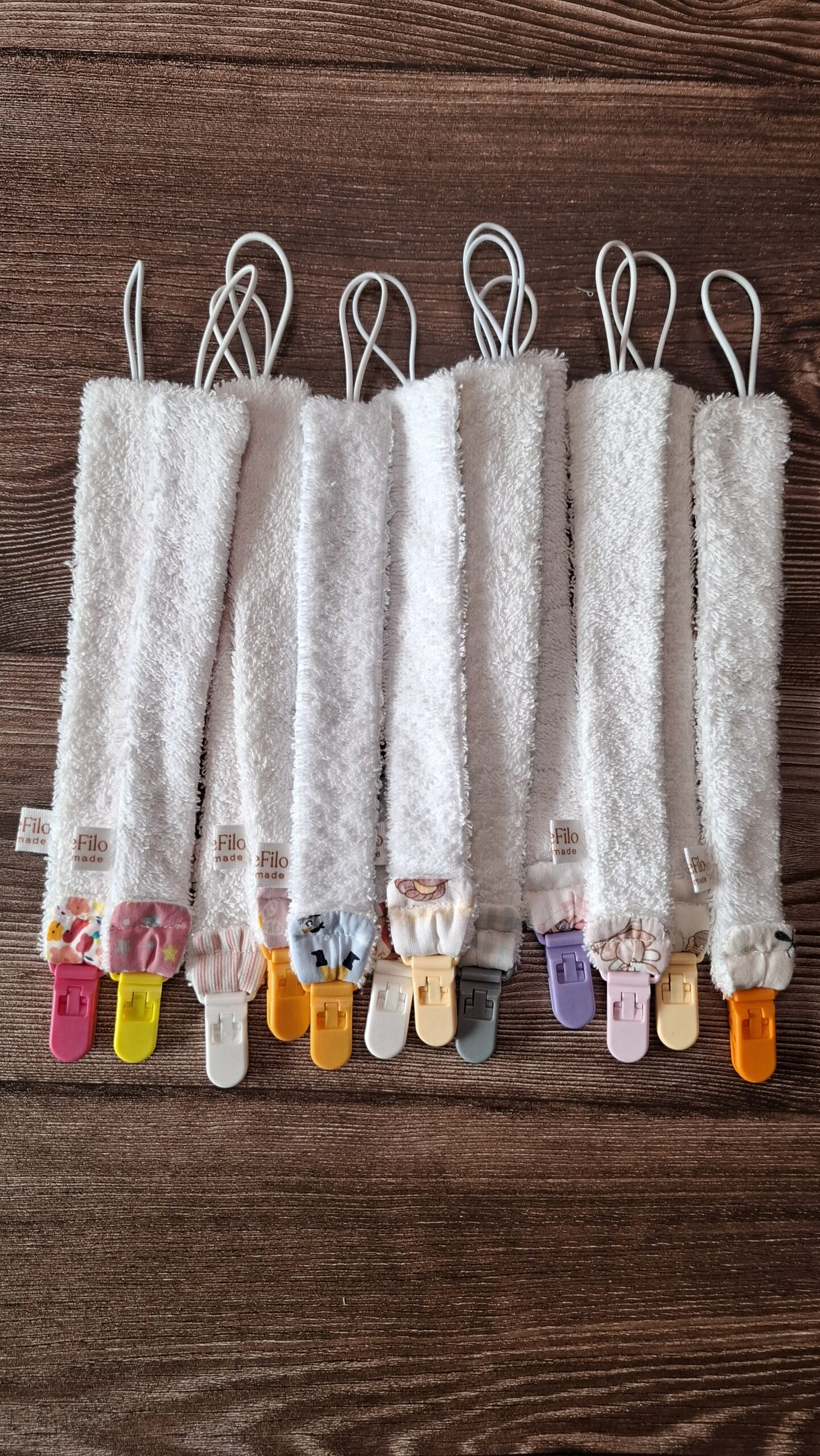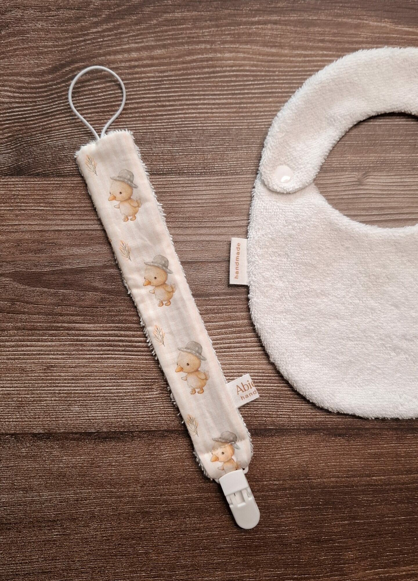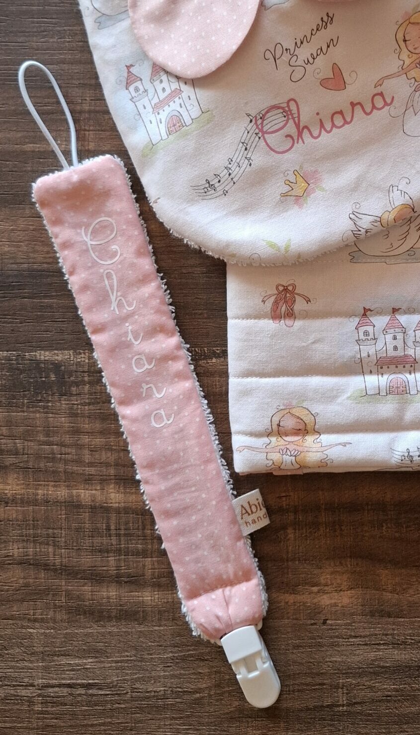 Elegante e sicuro, questo portaciuccio artigianale è un accessorio indispensabile per i primi mesi. Morbido e resistente, mantiene il ciuccio a portata di mano evitando la caduta o lo smarrimento.