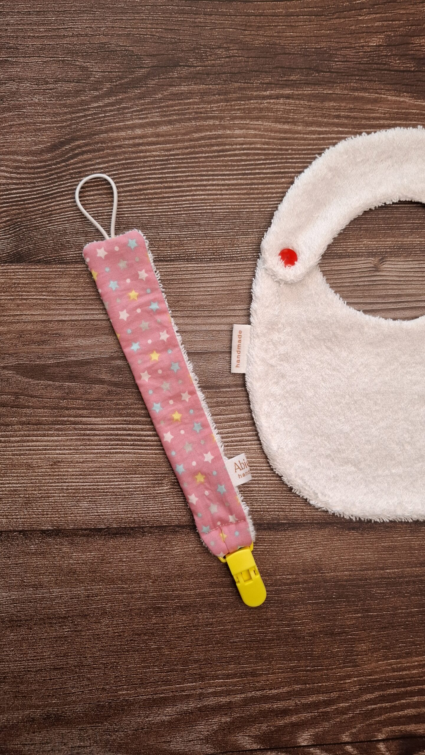 Elegante e sicuro, questo portaciuccio artigianale è un accessorio indispensabile per i primi mesi. Morbido e resistente, mantiene il ciuccio a portata di mano evitando la caduta o lo smarrimento.